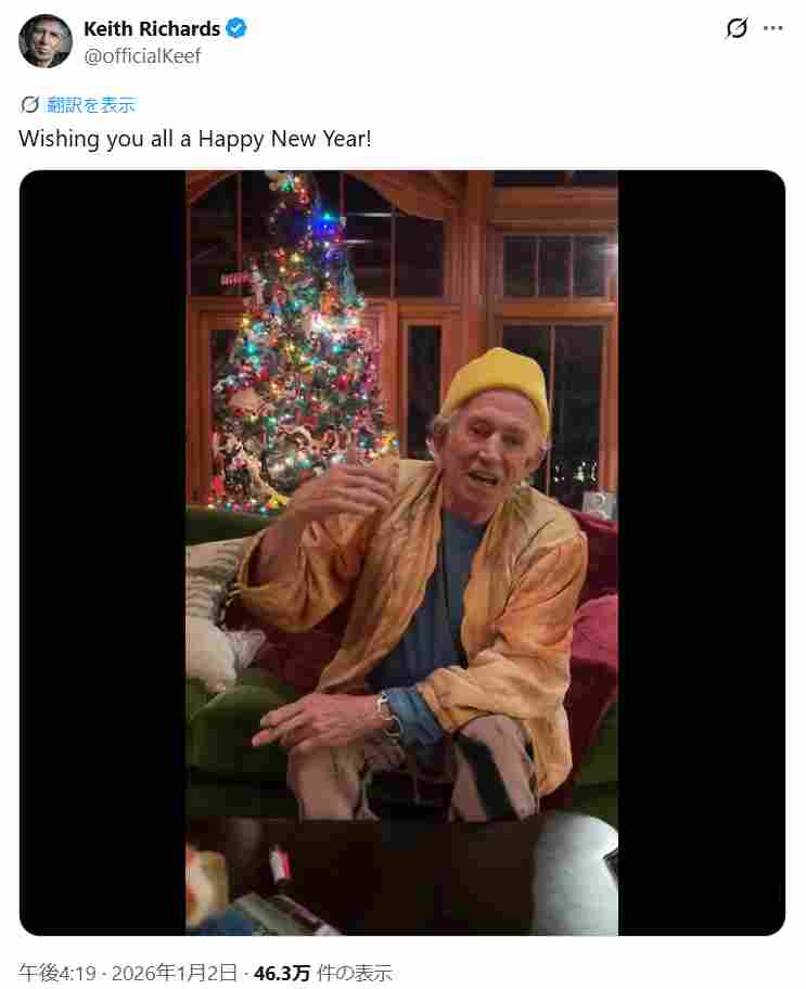 「ここでまた、もう一回、みんなに祝福を。そして、皆さんの休日が最高のものになりますように。明けましておめでとうございます。そして、また来年お会いできますように。頑張りましょう。皆さんを祝福します。ワン・ラブ」と、クリスマスツリーが飾られた自宅からファンに新年のメッセージを送ったのは、先月18日に82歳の誕生日を迎えたばかりのキース・リチャーズ。