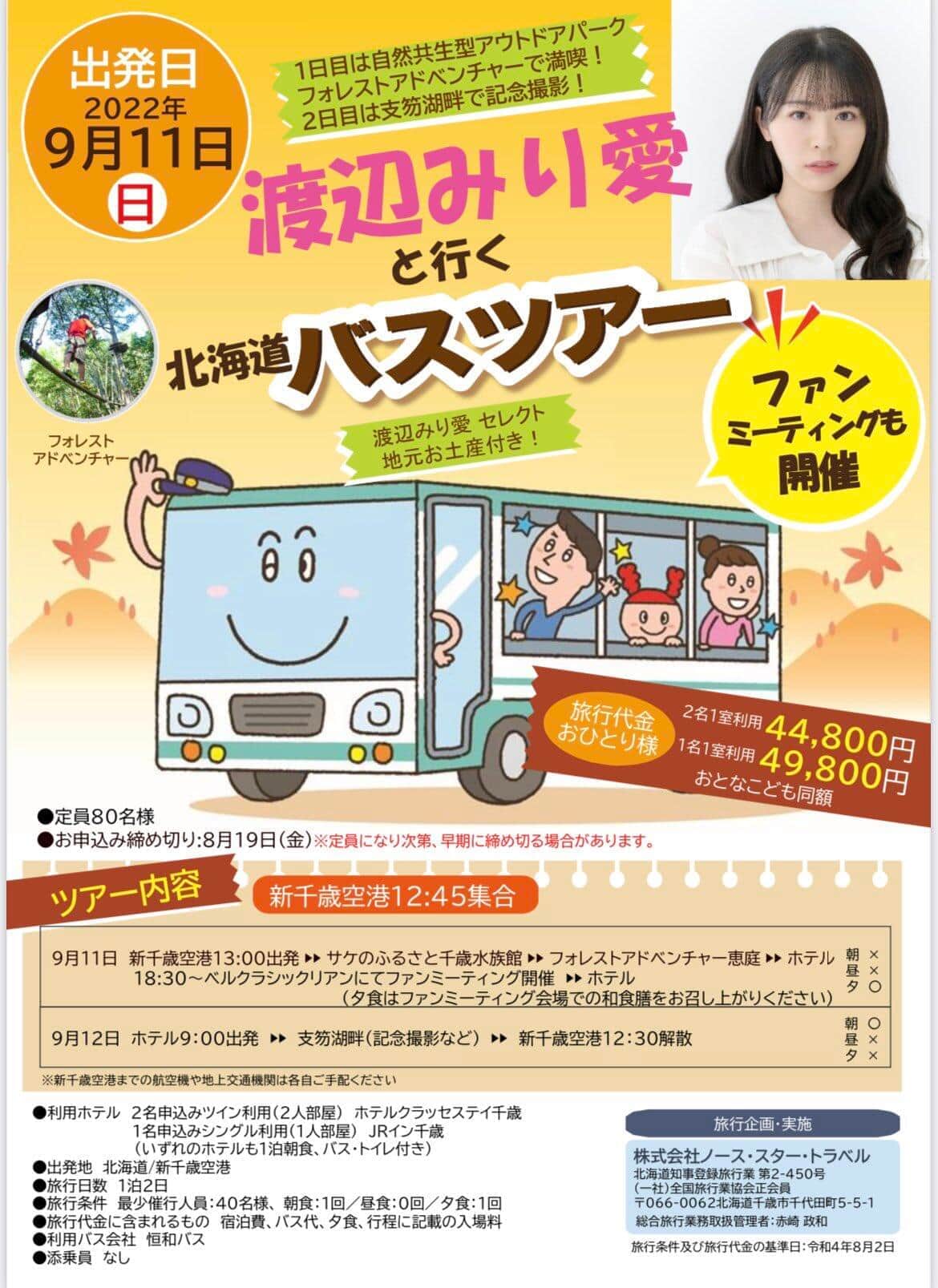 9月11日には、ファンとの交流イベント「渡辺みり愛と行く 北海道バスツアー」を予定していた。ツアー代金は約5万円で、定員は80人。8月6日からファンクラブ(FC)会員向けの抽選販売が、14日から一般販売が始まる予定だった。