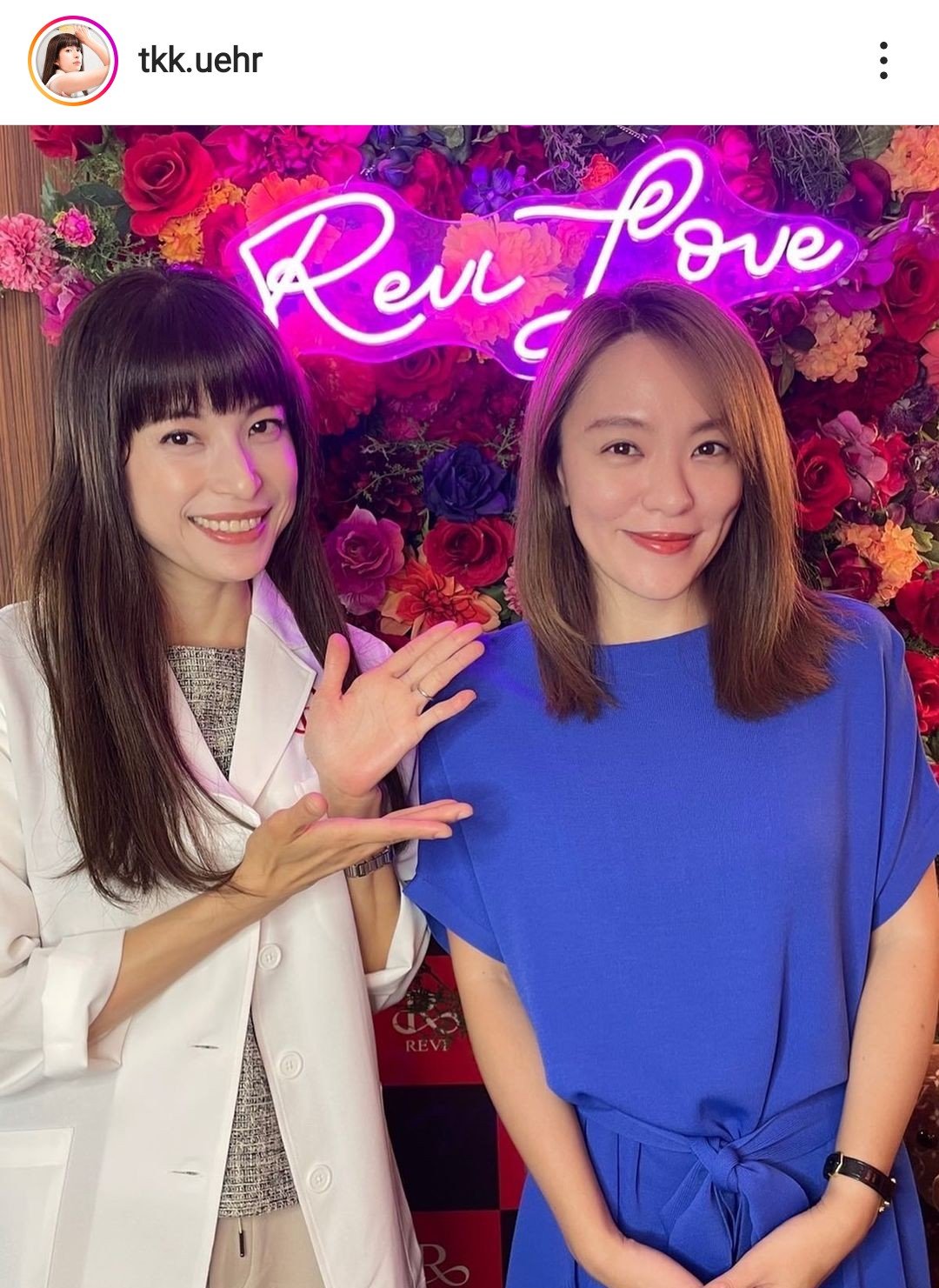 自身がサロンオーナーを勤めるコスメブランド「REVI」のネオンの前で、今井さんと撮影した笑顔の2ショットを投稿した上原さん。今井さんの39歳バースデーを祝福しながら「39歳もパワフルに! 絵理らしく」「お互い良い歳を重ねていこうね!」と盟友としてメッセージしています。