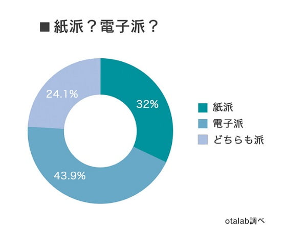 10代~60代の男女2,820人に向けて『Q.漫画を読むなら「紙派」「電子派」「どちらも使用する派」のうち、どれか?』の調査を行った結果、「電子派」が43.4%と一番多く支持される結果に。