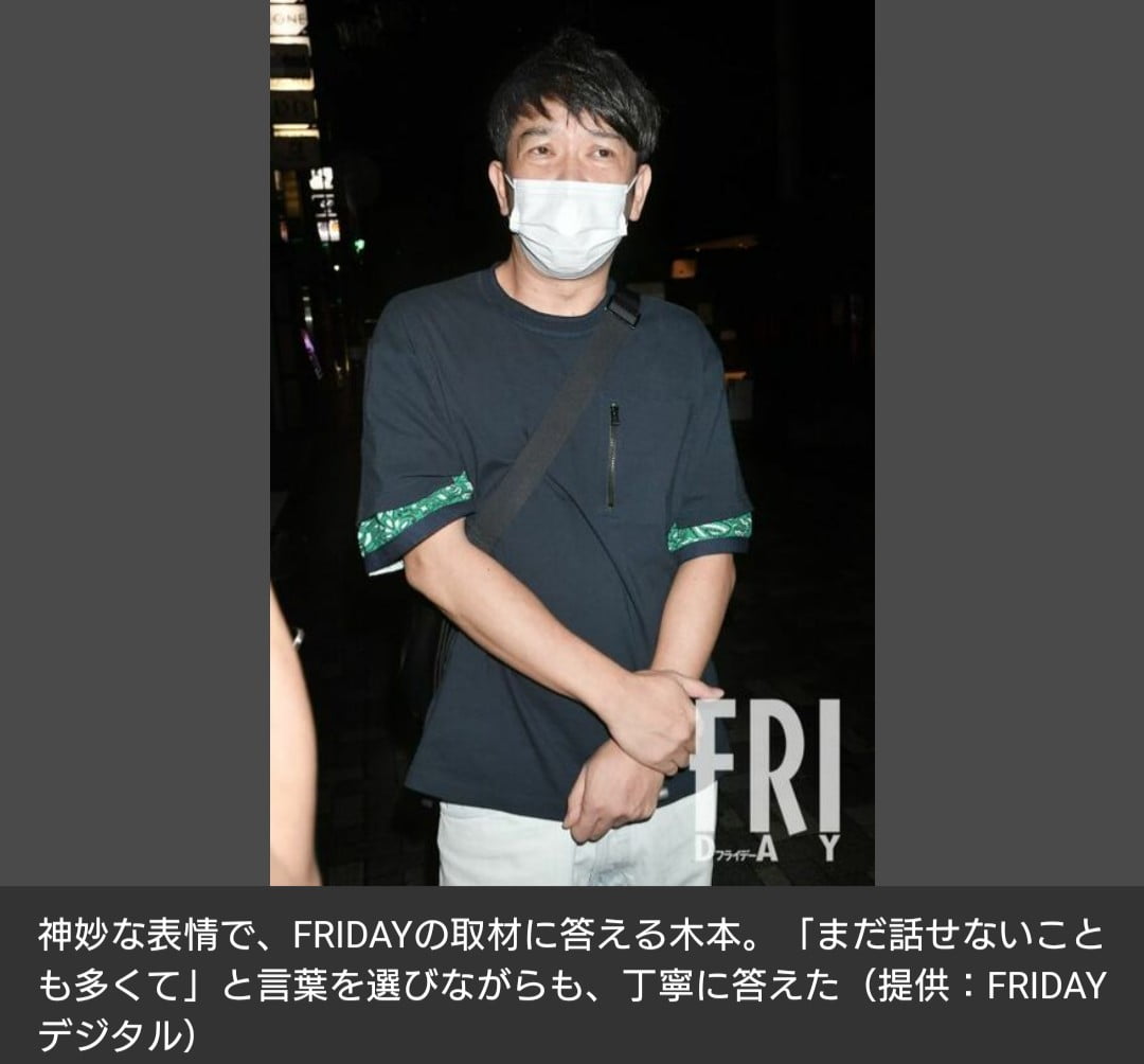 8月下旬の夜11時過ぎ、六本木(港区)の隠れ家バーから現れた『TKO』木本武宏(51)を直撃、騒動のその後について聞くと慎重に言葉を選びながら答えた。