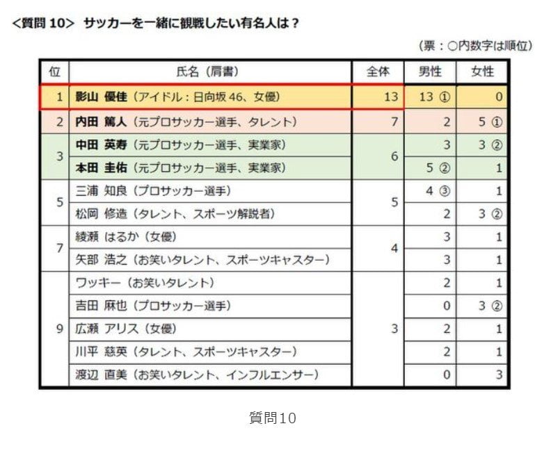サッカーを一緒に観戦したい有名人を聞いたところ、1位は日向坂46メンバーの「影山優佳さん」、2位は「内田篤人さん」、3位は「中田英寿さん」「本田圭佑さん」だった。
