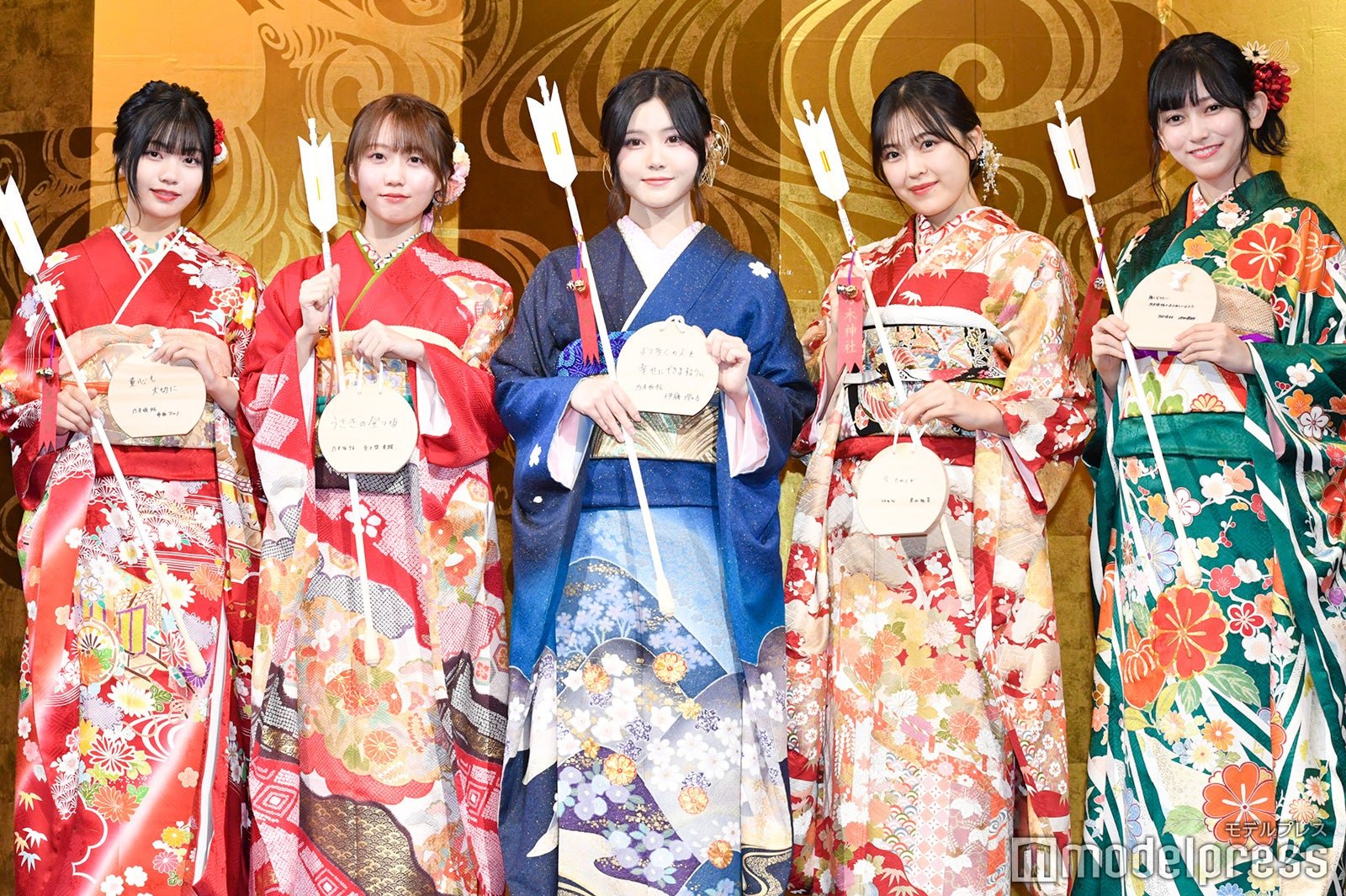可愛すぎる!中西アルノら新成人が艶やかな晴れ着姿で登場! (左から)中西アルノ、矢久保美緒、伊藤理々杏、柴田柚菜、池田瑛紗