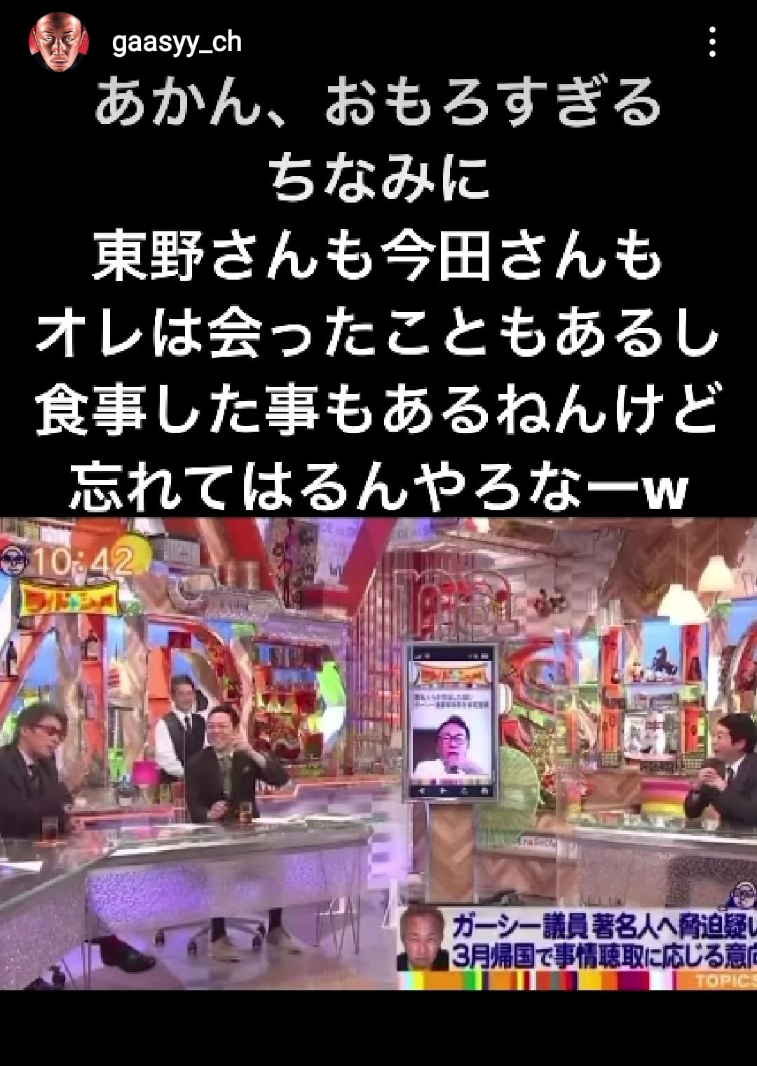放送を伝え聞いたガーシーは「東野さんも今田さんもオレは会ったこともあるし食事したこともあるねんけど 忘れてはるんやろなーw」とクギを刺しつつ、取り上げられたことを喜んでいた。