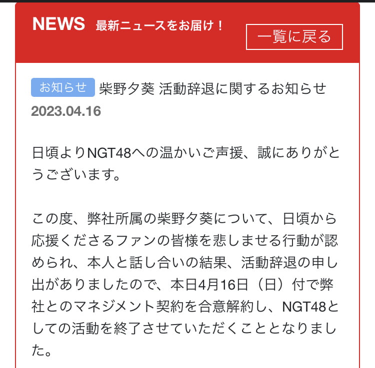 この度、弊社所属の柴野夕葵について、日頃から応援くださるファンの皆様を悲しませる行動が認められ、本人と話し合いの結果、活動辞退の申し出がありましたので、本日4月16日(日)付で弊社とのマネジメント契約を合意解約し、NGT48としての活動を終了させていただくこととなりました。