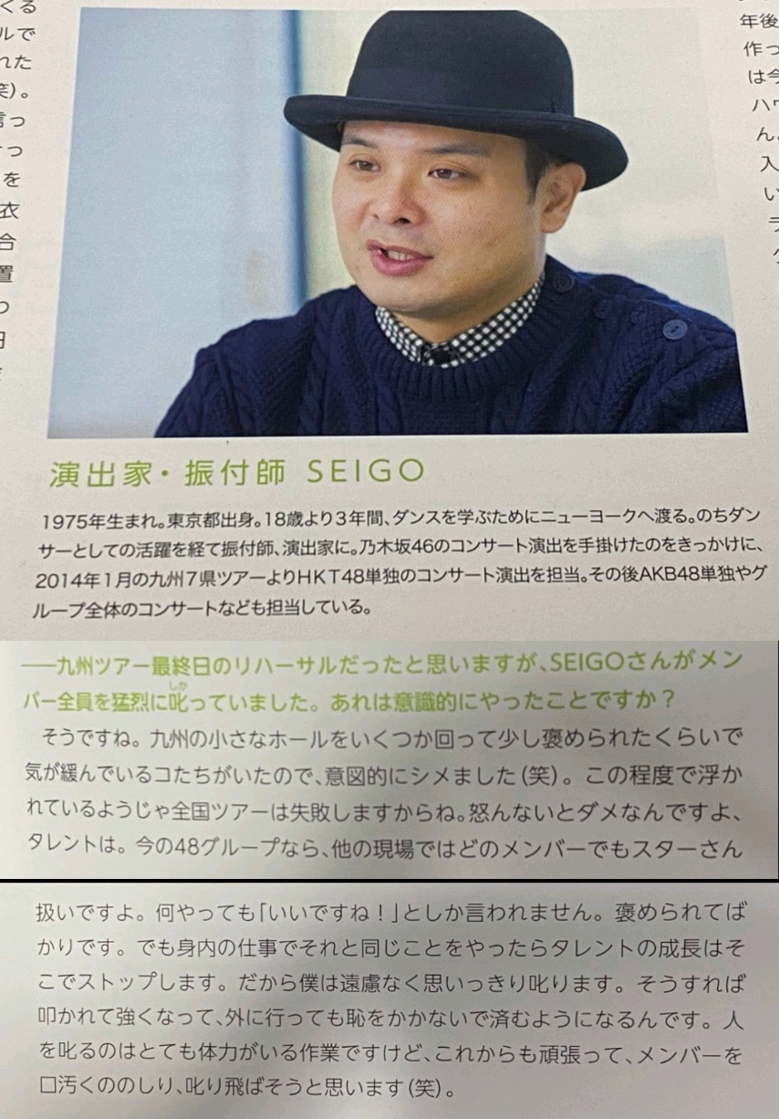 SEIGO氏は、1990年代から演出家、振付師としての活動をはじめ、初期はジャニーズ関連の仕事を多く引き受けていた。その後独立し、乃木坂46だけでなくAKB48、NMB48、HKT48、=LOVEなど多くのアイドルグループで演出を担当している。秋元康氏の信頼もあつく、実力は折り紙つきだという。