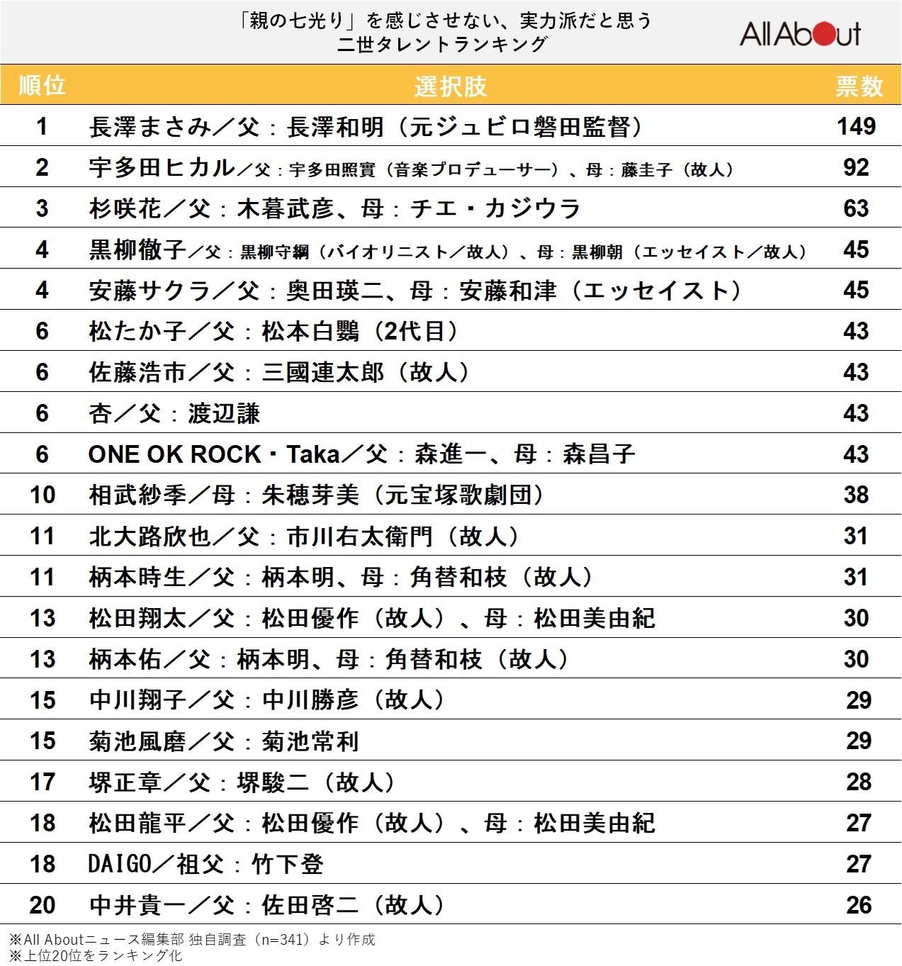 All About ニュース編集部は10月3日~11月2日の期間、全国10~70代の341人に「二世タレント」に関するアンケートを実施。その調査結果から「親の七光りを感じさせない、実力派だと思う二世タレント」ランキングを紹介します!