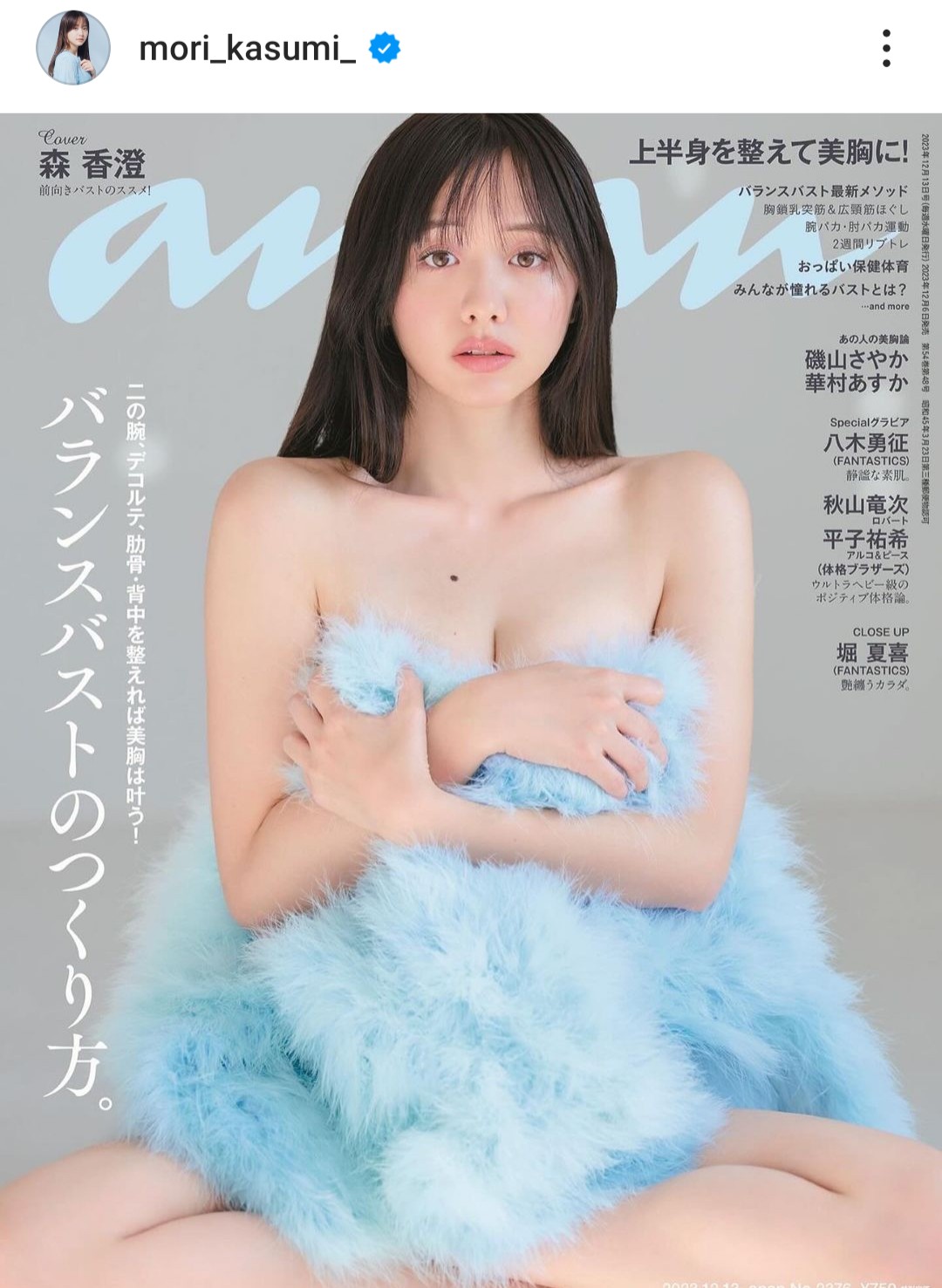 森アナは「anan2376号。表紙を務めさせていただきます。12/6発売です。是非、お手に取ってみてください。♡」とPRした。