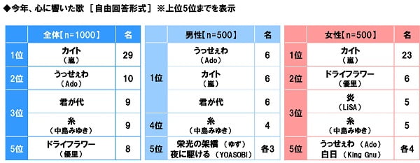 第1位は、嵐の「カイト」でした。女性ランキングでは圧倒的人気の1位、男性ランキングでも2位を獲得しています。作詞、作曲ともに米津玄師さんの「NHK2020ソング」として、「東京2020」で耳にすることも多かった曲。「母は言った『泣かないで』と、父は言った『逃げていい』と……」など、歌詞の内容も心に響く人が多かったようです。