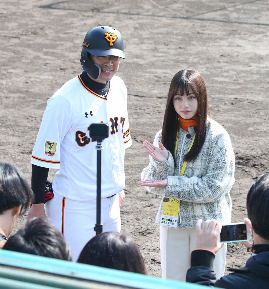 20年2月。キャンプに訪れた女優の橋本環奈(右)と写真に納まる亀井善行