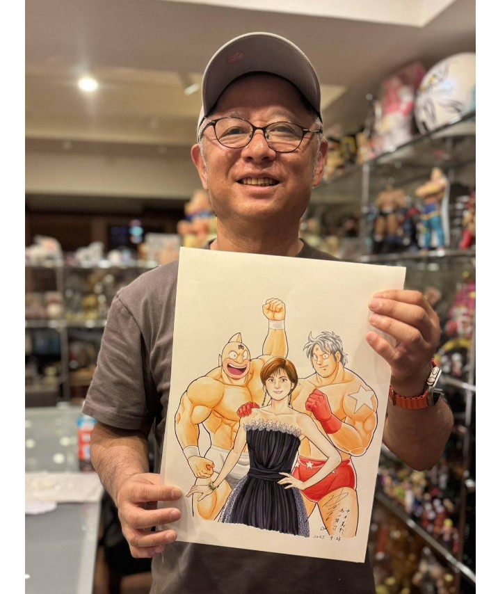 「それを聞いて描きましたよ。内田有紀さんとザ・マシンガンズの色紙を!!」として、キン肉マンとテリーマンのタッグチーム〝ザ・マシンガンズ〟の2人に挟まれた内田有紀が描かれた似顔絵イラストを公開した。