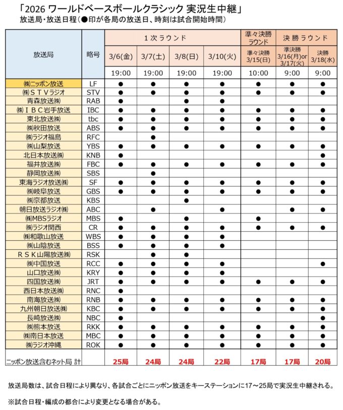 3月6日(金)よりニッポン放送が制作・生中継する『2026 ワールドベースボールクラシック 実況中継』は、ニッポン放送をキーステーションとして、計30のラジオ局で全国に生中継されることになった。