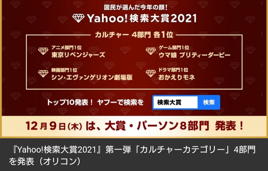 【Yahoo!検索大賞2021】アニメ部門は1位『東リベ』2位『呪術廻戦』3位『鬼滅の刃』 ゲームは『ウマ娘』、映画は『シン・エヴァ』が1位