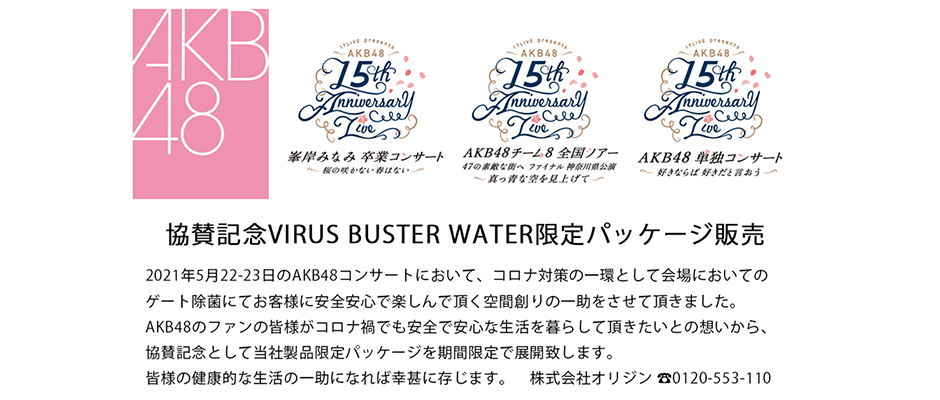 AKB48の公式ツイッターは、23日に《Origin VIRUS BUSTER WATERで空間除菌!》と動画付きで投稿。会場に設置された空間除菌ゲートをくぐって入場するファンの様子が公開されている。また、メンバーの下尾みうが商品名を挙げながら「今日も楽屋すごくキレイです。快適に過ごせてま~す」と商品をPRしている。