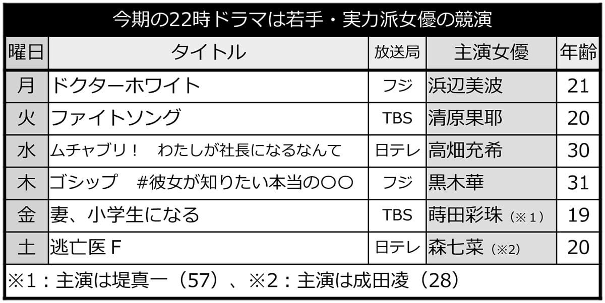 今期の民放連ドラは若手女優の競演であることにお気づきだろうか。中でも22時台のドラマは、月曜から土曜まで錚々たる顔ぶれが並んでいる。にもかかわらず、とうとう2桁の視聴率を記録する作品はなくなった。総崩れとなったワケを探る。