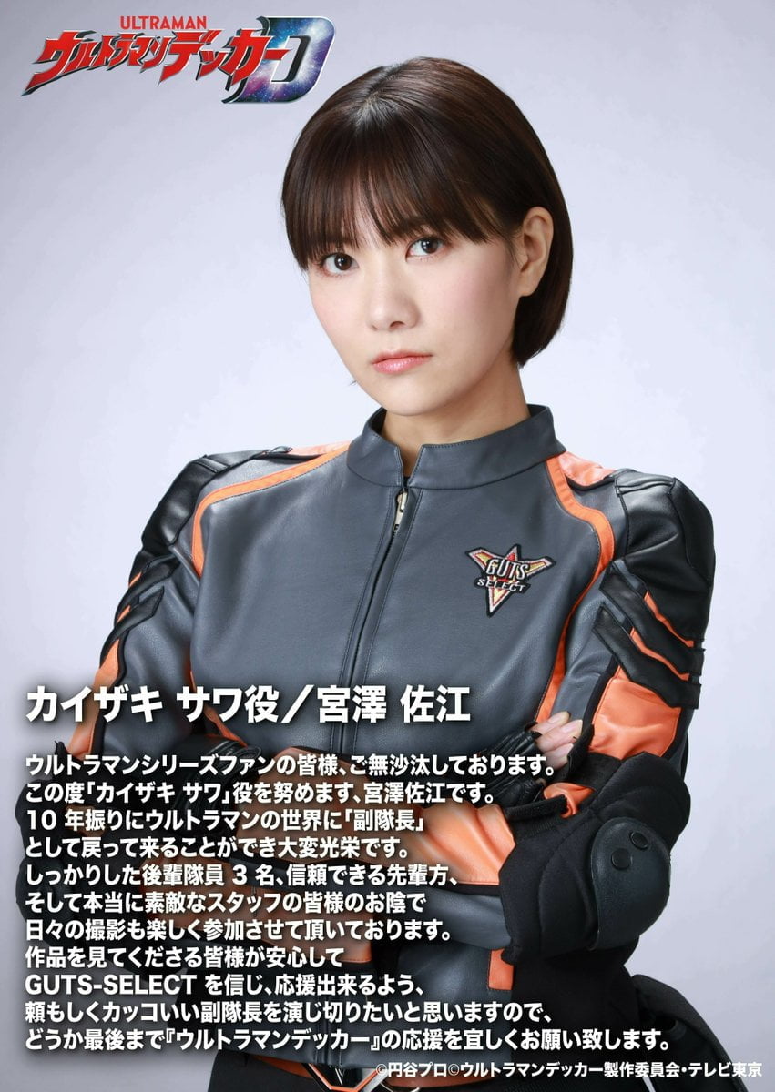 カイザキを演じることになった宮澤佐江は、アイドルグループSNH48、AKB48、SKE48の元メンバー。2012年公開の映画『ウルトラマンサーガ』で子供たちをバット星人の魔の手から守りぬいた地球防衛隊<チームU>の特攻隊長サワ役を務めた。宮澤は「頼もしくカッコいい副隊長を演じ切りたいと思いますので、どうか最後まで『ウルトラマンデッカー』の応援を宜しくお願い致します」とコメントを寄せている。